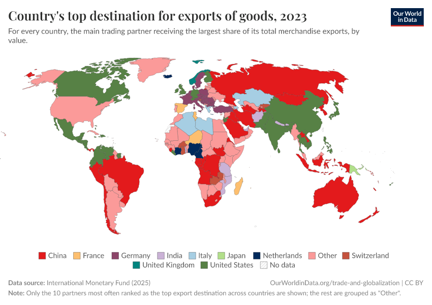 International Monetary Fund (2025) – with major processing by Our World in Data. “Top export partner category” [dataset]. International Monetary Fund, “International Trade in Goods (by partner country) (IMTS)” [original data]. Retrieved January 5, 2026 from https://search-sync-local-query.owid.pages.dev/grapher/countrys-top-destination-for-exports-of-goods