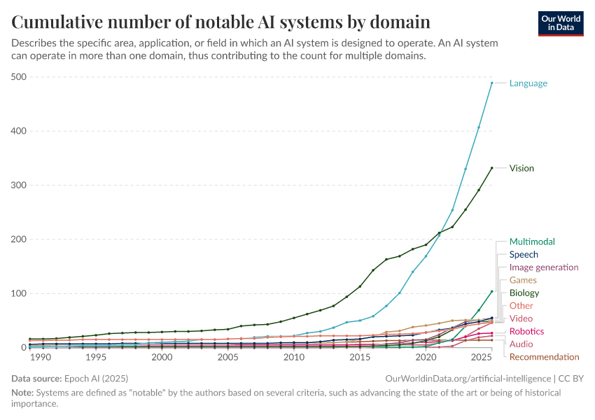 Epoch AI (2025) – with major processing by Our World in Data. “Cumulative number of notable AI systems by domain” [dataset]. Epoch AI, “Parameter, Compute and Data Trends in Machine Learning” [original data]. Retrieved January 5, 2026 from https://search-sync-local-query.owid.pages.dev/grapher/cumulative-number-of-notable-ai-systems-by-domain