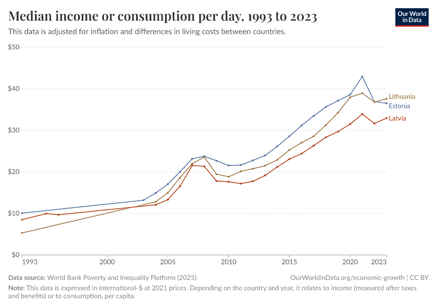 World Bank Poverty and Inequality Platform (2025) – with major processing by Our World in Data. “Median income or consumption per day – World Bank” [dataset]. World Bank Poverty and Inequality Platform, “World Bank Poverty and Inequality Platform (PIP) 20250930_2021, 20250930_2017” [original data]. Retrieved January 5, 2026 from https://search-sync-local-query.owid.pages.dev/grapher/daily-median-income