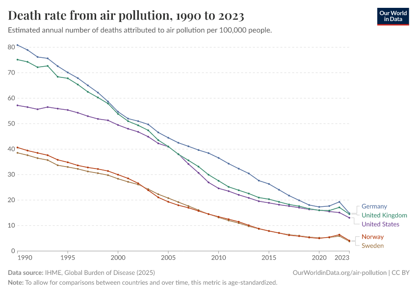 IHME, Global Burden of Disease (2024) – with minor processing by Our World in Data. “Death rate from air pollution” [dataset]. IHME, Global Burden of Disease, “Global Burden of Disease - Risk Factors” [original data]. Retrieved January 5, 2026 from https://search-sync-local-query.owid.pages.dev/grapher/death-rate-from-air-pollution-per-100000