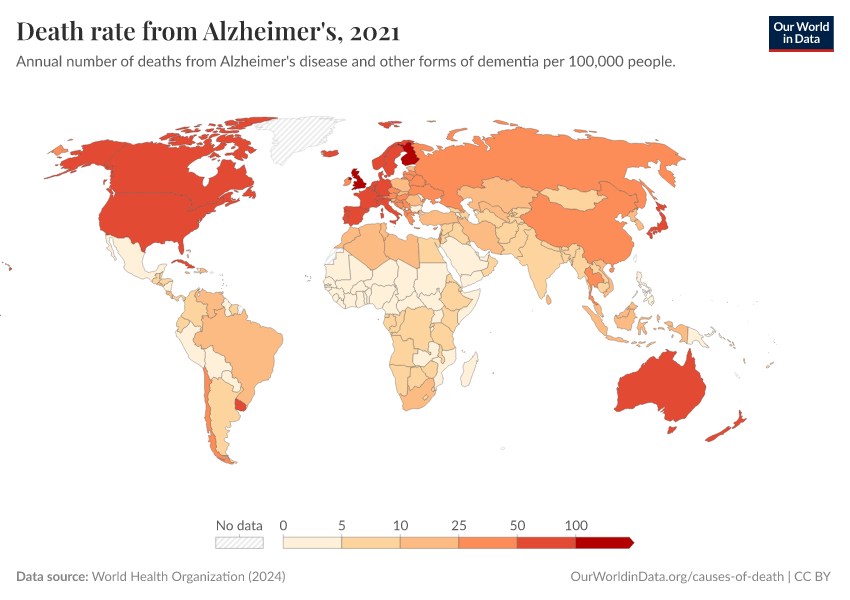 “Data Page: Death rate from Alzheimer's”, part of the following publication: Esteban Ortiz-Ospina and Max Roser (2016) - “Global Health”. Data adapted from World Health Organization. Retrieved from https://search-sync-local-query.owid.pages.dev/grapher/death-rate-from-alzheimers-other-dementias-ghe [online resource]How to cite this data