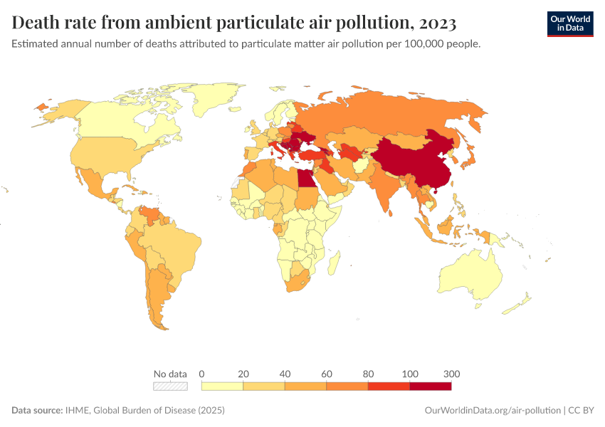 IHME, Global Burden of Disease (2024) – with minor processing by Our World in Data. “Death rate from ambient particulate air pollution” [dataset]. IHME, Global Burden of Disease, “Global Burden of Disease - Risk Factors” [original data]. Retrieved January 5, 2026 from https://search-sync-local-query.owid.pages.dev/grapher/death-rate-from-ambient-particulate-air-pollution