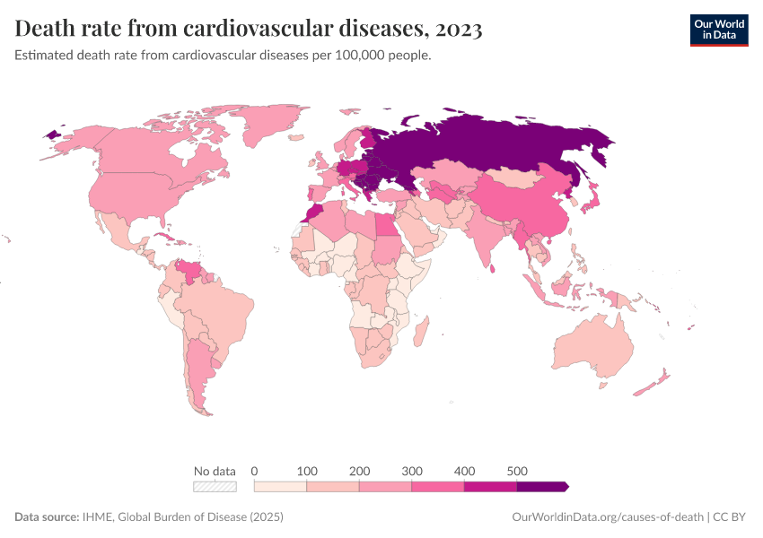 IHME, Global Burden of Disease (2024) – with minor processing by Our World in Data. “Death rate from cardiovascular diseases” [dataset]. IHME, Global Burden of Disease, “Global Burden of Disease - Deaths and DALYs” [original data]. Retrieved January 5, 2026 from https://search-sync-local-query.owid.pages.dev/grapher/death-rate-from-cardiovascular-diseases