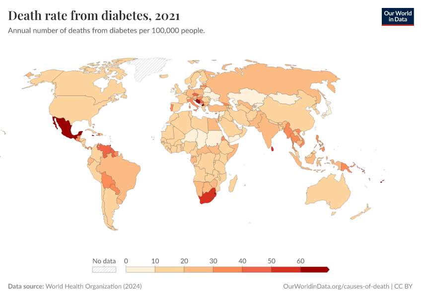 World Health Organization (2024) – with major processing by Our World in Data. “Death rate from diabetes” [dataset]. World Health Organization, “Global Health Estimates” [original data]. Retrieved January 5, 2026 from https://search-sync-local-query.owid.pages.dev/grapher/death-rate-from-diabetes-ghe