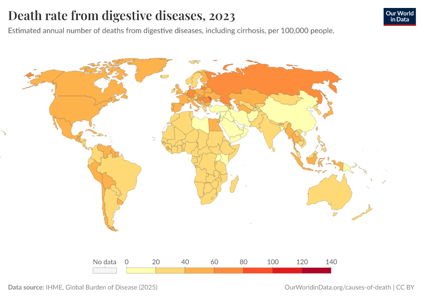 IHME, Global Burden of Disease (2024) – with minor processing by Our World in Data. “Death rate from digestive diseases” [dataset]. IHME, Global Burden of Disease, “Global Burden of Disease - Deaths and DALYs” [original data]. Retrieved January 5, 2026 from https://search-sync-local-query.owid.pages.dev/grapher/death-rate-from-digestive-diseases-gbd
