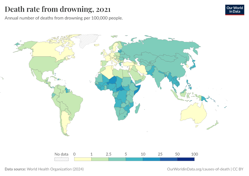 World Health Organization (2024) – with major processing by Our World in Data. “Death rate from drowning” [dataset]. World Health Organization, “Global Health Estimates” [original data]. Retrieved January 5, 2026 from https://search-sync-local-query.owid.pages.dev/grapher/death-rate-from-drowning-ghe