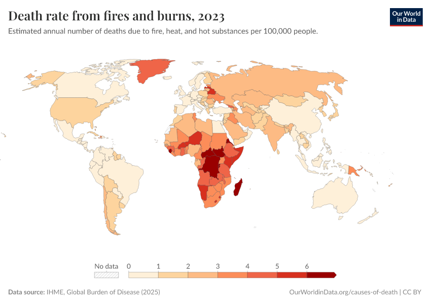 IHME, Global Burden of Disease (2024) – with minor processing by Our World in Data. “Death rate from fires and burns” [dataset]. IHME, Global Burden of Disease, “Global Burden of Disease - Deaths and DALYs” [original data]. Retrieved January 5, 2026 from https://search-sync-local-query.owid.pages.dev/grapher/death-rate-from-fires-and-burns-ihme