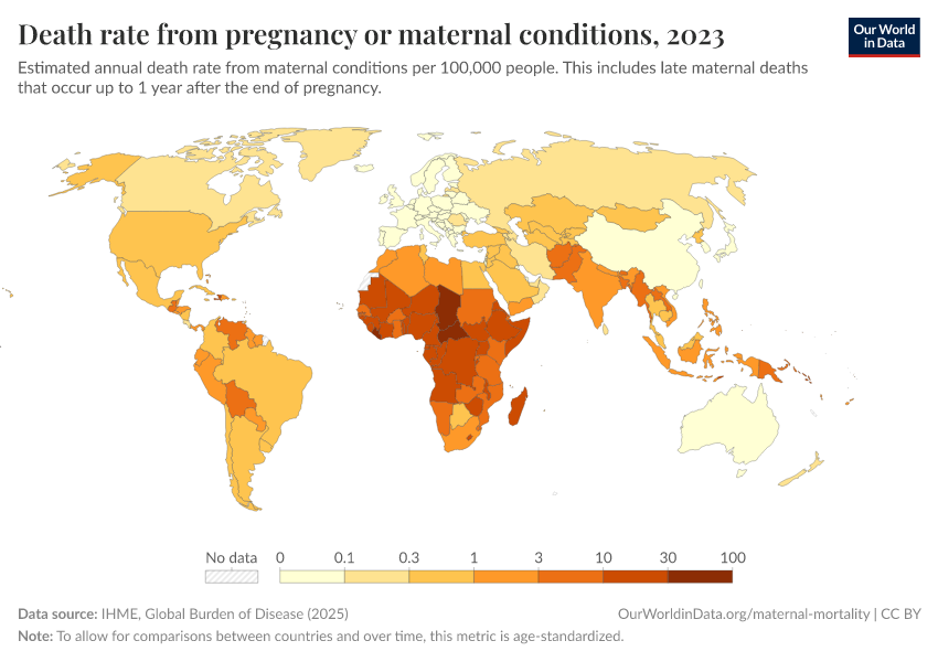 IHME, Global Burden of Disease (2024) – with minor processing by Our World in Data. “Death rate from pregnancy or maternal conditions” [dataset]. IHME, Global Burden of Disease, “Global Burden of Disease - Deaths and DALYs” [original data]. Retrieved January 5, 2026 from https://search-sync-local-query.owid.pages.dev/grapher/death-rate-from-maternal-disorders-ihme
