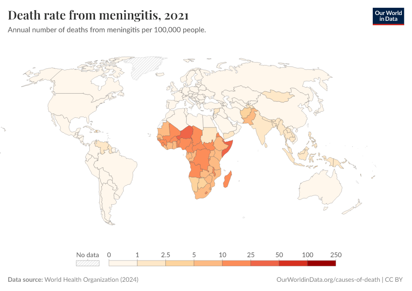 World Health Organization (2024) – with major processing by Our World in Data. “Death rate from meningitis” [dataset]. World Health Organization, “Global Health Estimates” [original data]. Retrieved January 5, 2026 from https://search-sync-local-query.owid.pages.dev/grapher/death-rate-from-meningitis-who