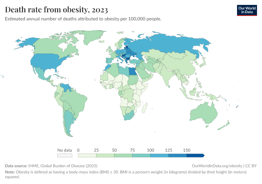 IHME, Global Burden of Disease (2024) – with minor processing by Our World in Data. “Death rate from obesity” [dataset]. IHME, Global Burden of Disease, “Global Burden of Disease - Risk Factors” [original data]. Retrieved January 5, 2026 from https://search-sync-local-query.owid.pages.dev/grapher/death-rate-from-obesity-gbd