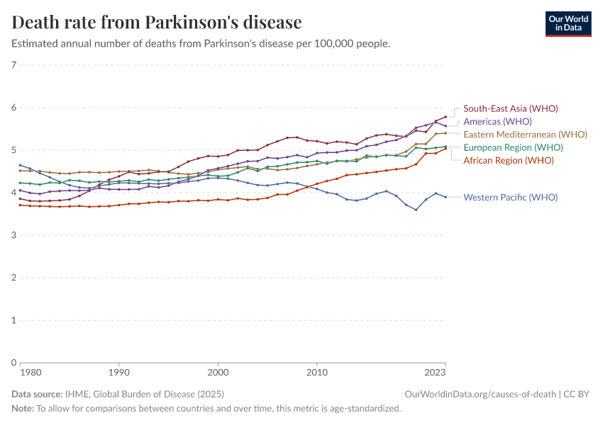 IHME, Global Burden of Disease (2024) – with minor processing by Our World in Data. “Death rate from Parkinson's disease” [dataset]. IHME, Global Burden of Disease, “Global Burden of Disease - Deaths and DALYs” [original data]. Retrieved January 5, 2026 from https://search-sync-local-query.owid.pages.dev/grapher/death-rate-from-parkinsons-disease