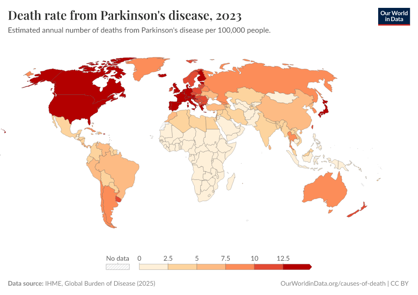IHME, Global Burden of Disease (2024) – with minor processing by Our World in Data. “Death rate from Parkinson's disease” [dataset]. IHME, Global Burden of Disease, “Global Burden of Disease - Deaths and DALYs” [original data]. Retrieved January 5, 2026 from https://search-sync-local-query.owid.pages.dev/grapher/death-rate-from-parkinsons-disease-gbd