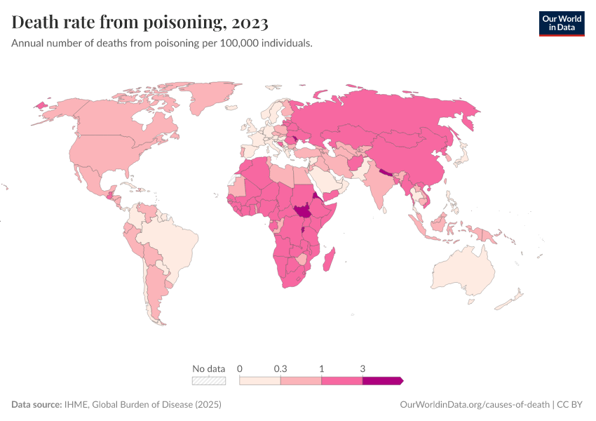 IHME, Global Burden of Disease (2024) – with minor processing by Our World in Data. “Death rate from poisoning” [dataset]. IHME, Global Burden of Disease, “Global Burden of Disease - Deaths and DALYs” [original data]. Retrieved January 5, 2026 from https://search-sync-local-query.owid.pages.dev/grapher/death-rate-from-poisoning-gbd