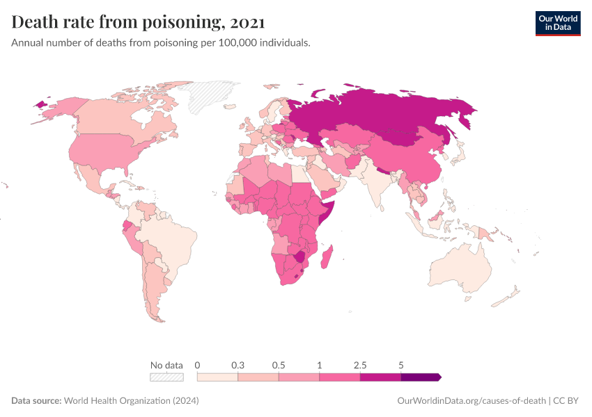 World Health Organization (2024) – with major processing by Our World in Data. “Death rate from poisoning” [dataset]. World Health Organization, “Global Health Estimates” [original data]. Retrieved January 5, 2026 from https://search-sync-local-query.owid.pages.dev/grapher/death-rate-from-poisoning-ghe
