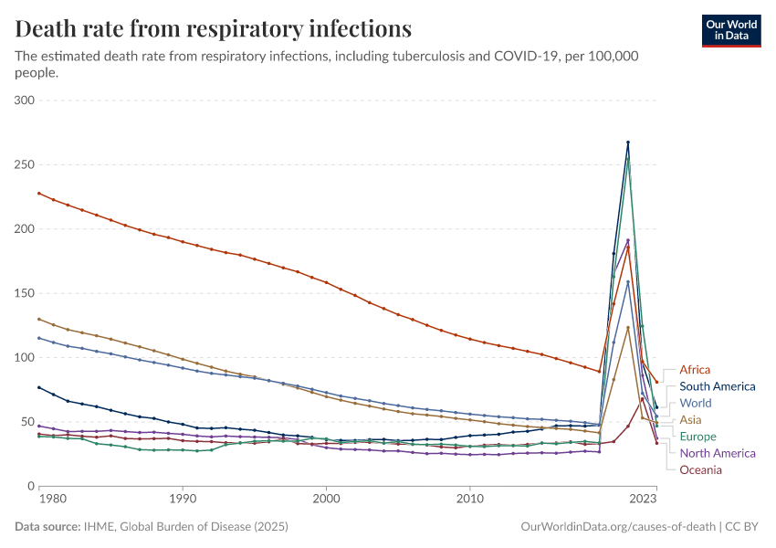 IHME, Global Burden of Disease (2024) – with minor processing by Our World in Data. “Death rate from respiratory infections” [dataset]. IHME, Global Burden of Disease, “Global Burden of Disease - Deaths and DALYs” [original data]. Retrieved January 5, 2026 from https://search-sync-local-query.owid.pages.dev/grapher/death-rate-from-respiratory-infections-gbd