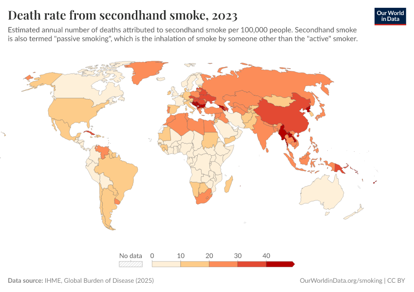 IHME, Global Burden of Disease (2024) – with minor processing by Our World in Data. “Death rate from secondhand smoke” [dataset]. IHME, Global Burden of Disease, “Global Burden of Disease - Risk Factors” [original data]. Retrieved January 5, 2026 from https://search-sync-local-query.owid.pages.dev/grapher/death-rate-from-secondhand-smoke-gbd