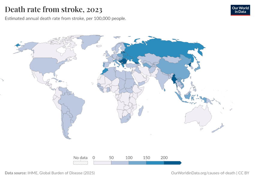 IHME, Global Burden of Disease (2024) – with minor processing by Our World in Data. “Death rate from stroke” [dataset]. IHME, Global Burden of Disease, “Global Burden of Disease - Deaths and DALYs” [original data]. Retrieved January 5, 2026 from https://search-sync-local-query.owid.pages.dev/grapher/death-rate-from-strokes
