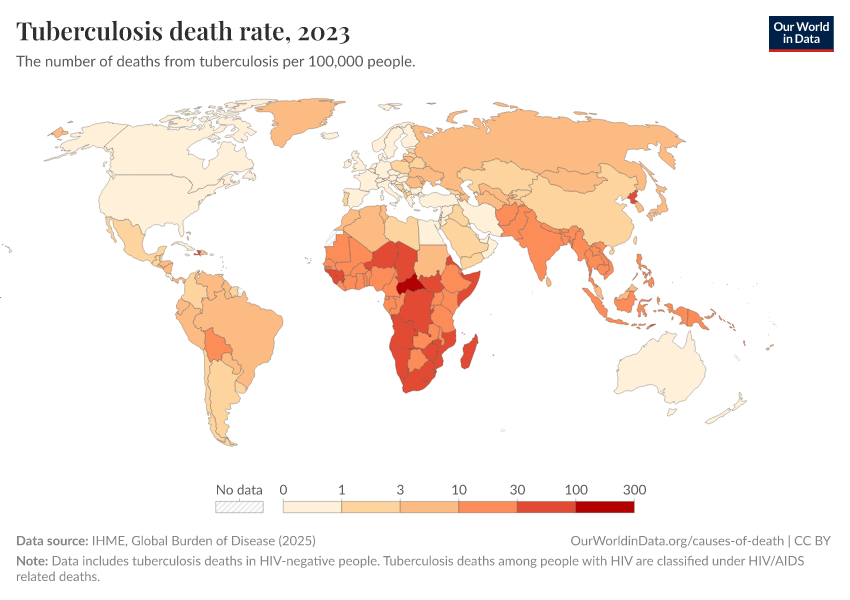 IHME, Global Burden of Disease (2024) – with minor processing by Our World in Data. “Tuberculosis death rate” [dataset]. IHME, Global Burden of Disease, “Global Burden of Disease - Deaths and DALYs” [original data]. Retrieved January 5, 2026 from https://search-sync-local-query.owid.pages.dev/grapher/death-rate-from-tuberculosis-gbd
