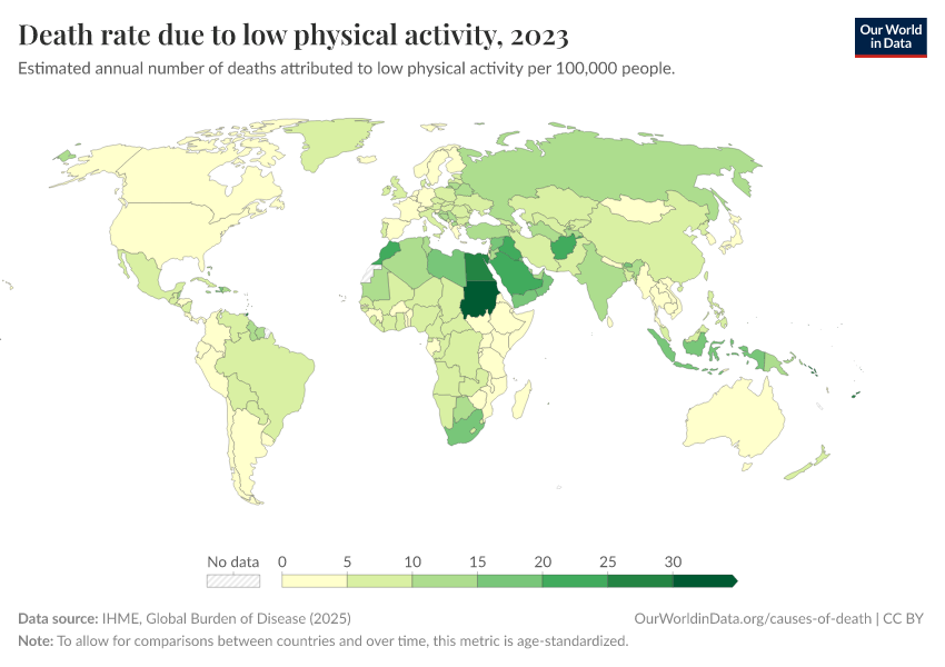 “Data Page: Death rate due to low physical activity”, part of the following publication: Esteban Ortiz-Ospina and Max Roser (2016) - “Global Health”. Data adapted from IHME, Global Burden of Disease. Retrieved from https://search-sync-local-query.owid.pages.dev/grapher/death-rates-due-to-low-physical-activity [online resource]How to cite this data