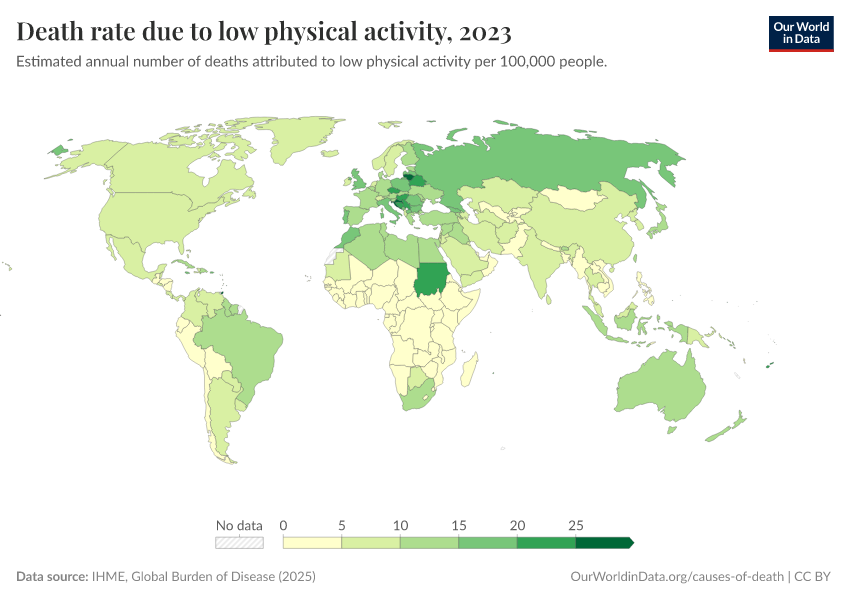 “Data Page: Death rate due to low physical activity”, part of the following publication: Esteban Ortiz-Ospina and Max Roser (2016) - “Global Health”. Data adapted from IHME, Global Burden of Disease. Retrieved from https://search-sync-local-query.owid.pages.dev/grapher/death-rates-due-to-low-physical-activity-gbd [online resource]How to cite this data