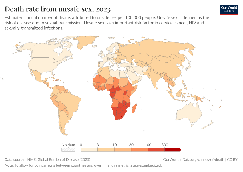 IHME, Global Burden of Disease (2024) – with minor processing by Our World in Data. “Death rate from unsafe sex” [dataset]. IHME, Global Burden of Disease, “Global Burden of Disease - Risk Factors” [original data]. Retrieved January 5, 2026 from https://search-sync-local-query.owid.pages.dev/grapher/death-rates-from-unsafe-sex