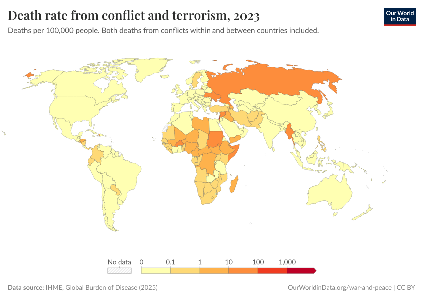 IHME, Global Burden of Disease (2024) – with minor processing by Our World in Data. “Death rate from conflict and terrorism” [dataset]. IHME, Global Burden of Disease, “Global Burden of Disease - Deaths and DALYs” [original data]. Retrieved January 5, 2026 from https://search-sync-local-query.owid.pages.dev/grapher/deaths-conflict-terrorism-per-100000