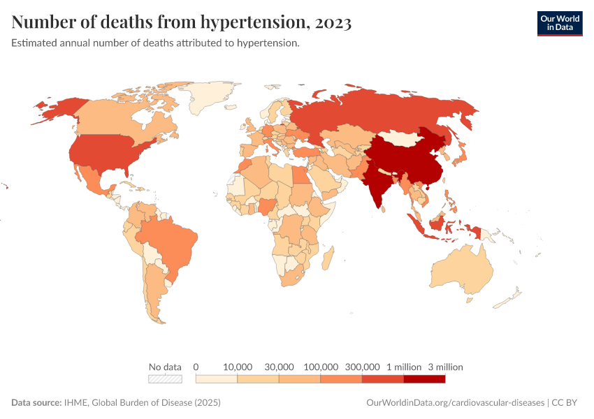 IHME, Global Burden of Disease (2024) – with minor processing by Our World in Data. “Number of deaths from hypertension” [dataset]. IHME, Global Burden of Disease, “Global Burden of Disease - Risk Factors” [original data]. Retrieved January 5, 2026 from https://search-sync-local-query.owid.pages.dev/grapher/deaths-due-to-high-blood-pressure