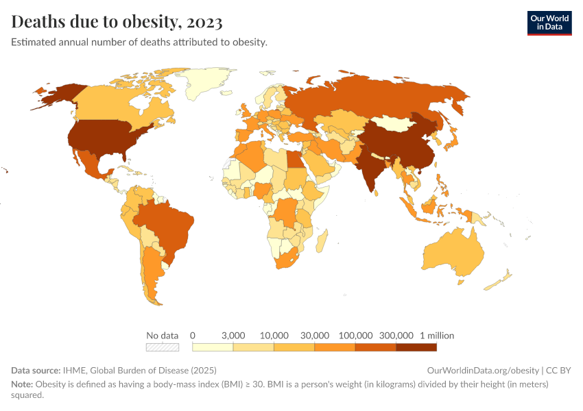IHME, Global Burden of Disease (2024) – with minor processing by Our World in Data. “Deaths due to obesity” [dataset]. IHME, Global Burden of Disease, “Global Burden of Disease - Risk Factors” [original data]. Retrieved January 5, 2026 from https://search-sync-local-query.owid.pages.dev/grapher/deaths-due-to-obesity