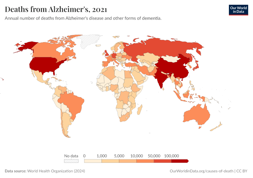 “Data Page: Deaths from Alzheimer's”, part of the following publication: Esteban Ortiz-Ospina and Max Roser (2016) - “Global Health”. Data adapted from World Health Organization. Retrieved from https://search-sync-local-query.owid.pages.dev/grapher/deaths-from-alzheimers-other-dementias [online resource]How to cite this data