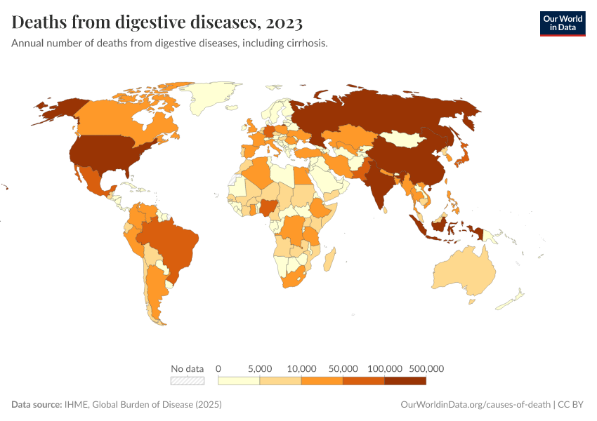 “Data Page: Deaths from digestive diseases”, part of the following publication: Esteban Ortiz-Ospina and Max Roser (2016) - “Global Health”. Data adapted from IHME, Global Burden of Disease. Retrieved from https://search-sync-local-query.owid.pages.dev/grapher/deaths-from-digestive-diseases [online resource]How to cite this data