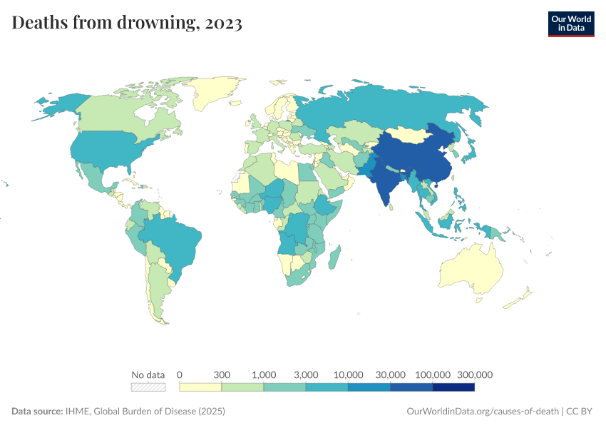 IHME, Global Burden of Disease (2024) – with minor processing by Our World in Data. “Deaths from drowning” [dataset]. IHME, Global Burden of Disease, “Global Burden of Disease - Deaths and DALYs” [original data]. Retrieved January 5, 2026 from https://search-sync-local-query.owid.pages.dev/grapher/deaths-from-drowning