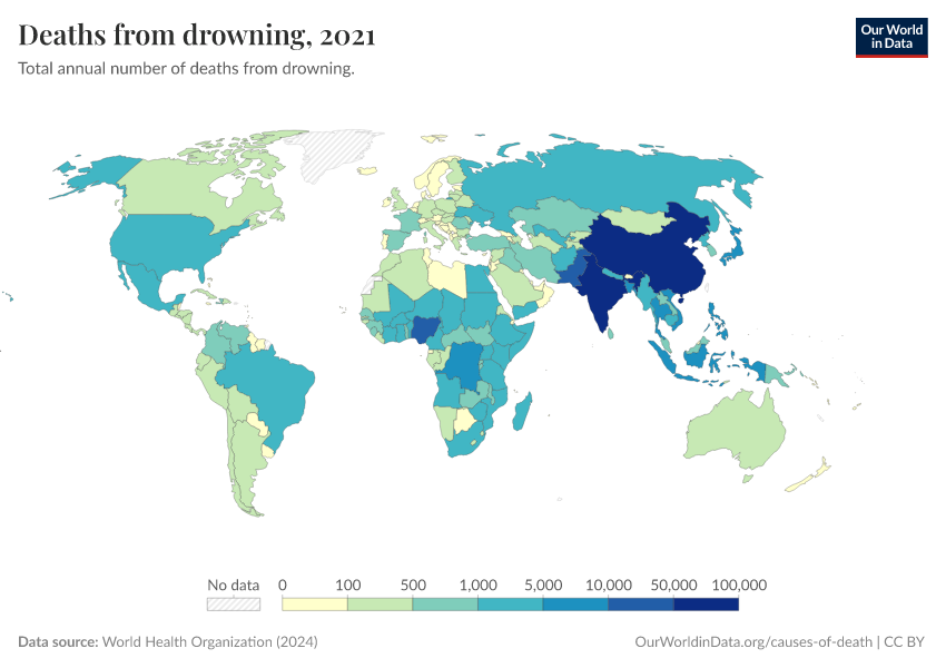 “Data Page: Deaths from drowning”, part of the following publication: Esteban Ortiz-Ospina and Max Roser (2016) - “Global Health”. Data adapted from World Health Organization. Retrieved from https://search-sync-local-query.owid.pages.dev/grapher/deaths-from-drowning-ghe [online resource]How to cite this data
