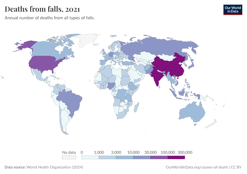 World Health Organization (2024) – with major processing by Our World in Data. “Deaths from falls” [dataset]. World Health Organization, “Global Health Estimates” [original data]. Retrieved January 5, 2026 from https://search-sync-local-query.owid.pages.dev/grapher/deaths-from-falls