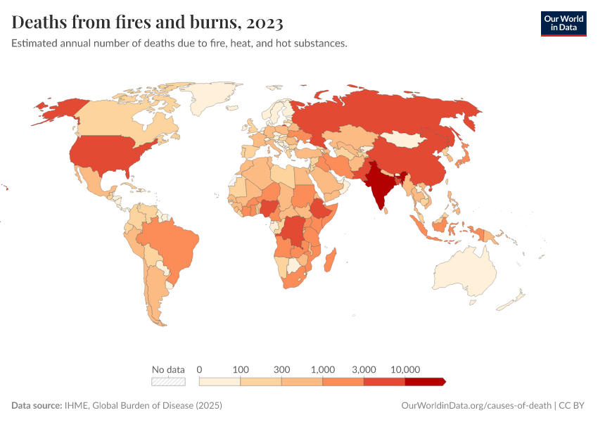 “Data Page: Deaths from fires and burns”, part of the following publication: Esteban Ortiz-Ospina and Max Roser (2016) - “Global Health”. Data adapted from IHME, Global Burden of Disease. Retrieved from https://search-sync-local-query.owid.pages.dev/grapher/deaths-from-fires-and-burns [online resource]How to cite this data