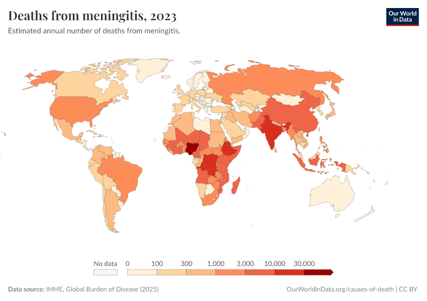IHME, Global Burden of Disease (2024) – with minor processing by Our World in Data. “Deaths from meningitis” [dataset]. IHME, Global Burden of Disease, “Global Burden of Disease - Deaths and DALYs” [original data]. Retrieved January 5, 2026 from https://search-sync-local-query.owid.pages.dev/grapher/deaths-from-meningitis