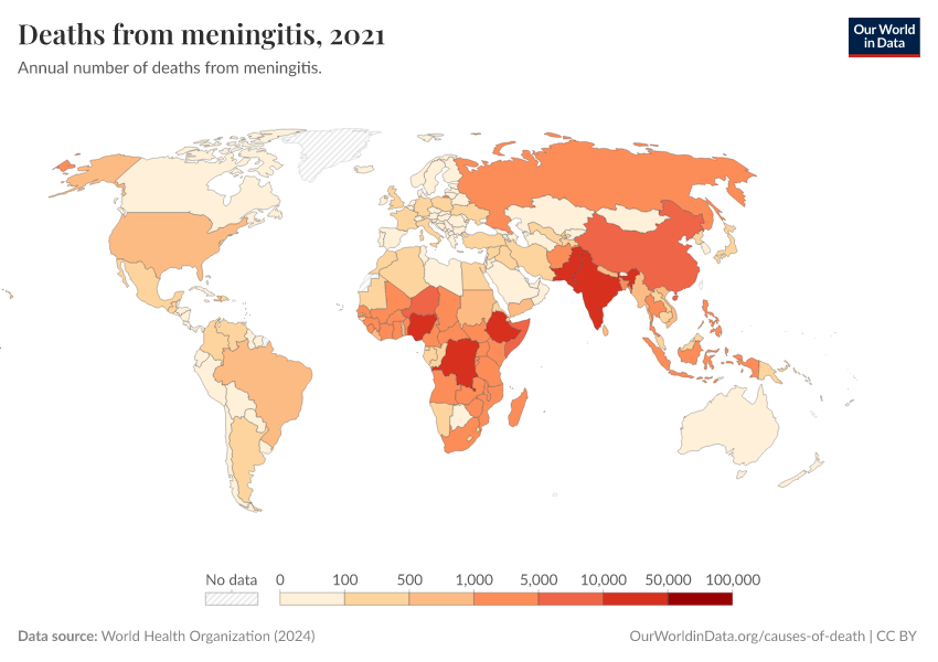“Data Page: Deaths from meningitis”, part of the following publication: Esteban Ortiz-Ospina and Max Roser (2016) - “Global Health”. Data adapted from World Health Organization. Retrieved from https://search-sync-local-query.owid.pages.dev/grapher/deaths-from-meningitis-ghe [online resource]How to cite this data