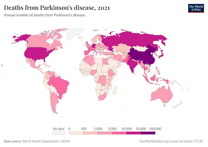 World Health Organization (2024) – with major processing by Our World in Data. “Deaths from Parkinson's disease” [dataset]. World Health Organization, “Global Health Estimates” [original data]. Retrieved January 5, 2026 from https://search-sync-local-query.owid.pages.dev/grapher/deaths-from-parkinsons-disease-ghe