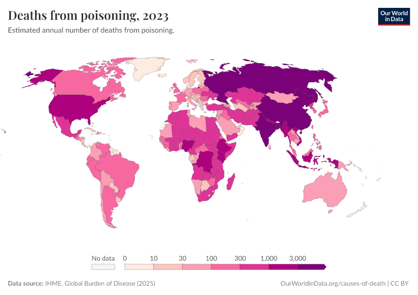 IHME, Global Burden of Disease (2024) – with minor processing by Our World in Data. “Deaths from poisoning” [dataset]. IHME, Global Burden of Disease, “Global Burden of Disease - Deaths and DALYs” [original data]. Retrieved January 5, 2026 from https://search-sync-local-query.owid.pages.dev/grapher/deaths-from-poisoning