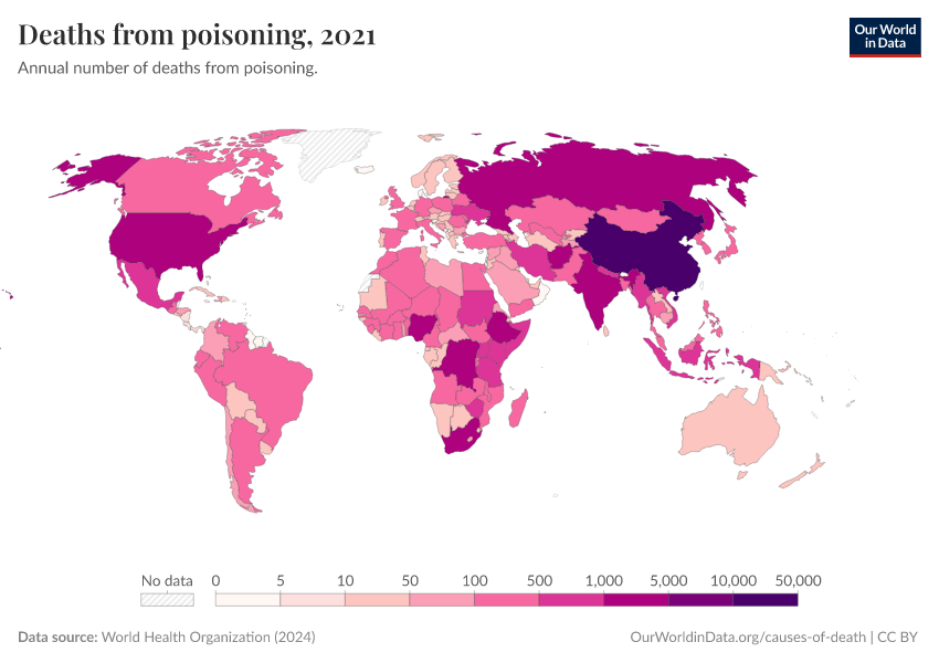World Health Organization (2024) – with major processing by Our World in Data. “Deaths from poisoning” [dataset]. World Health Organization, “Global Health Estimates” [original data]. Retrieved January 5, 2026 from https://search-sync-local-query.owid.pages.dev/grapher/deaths-from-poisonings-ghe