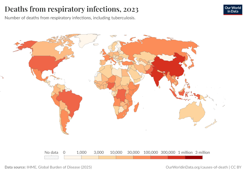 IHME, Global Burden of Disease (2024) – with minor processing by Our World in Data. “Deaths from respiratory infections” [dataset]. IHME, Global Burden of Disease, “Global Burden of Disease - Deaths and DALYs” [original data]. Retrieved January 5, 2026 from https://search-sync-local-query.owid.pages.dev/grapher/deaths-from-respiratory-infections