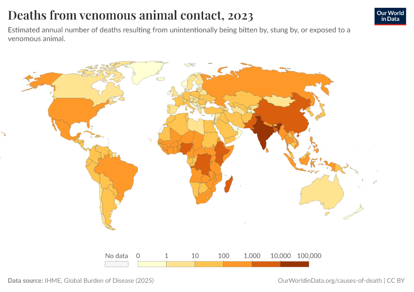 IHME, Global Burden of Disease (2024) – with minor processing by Our World in Data. “Deaths from venomous animal contact” [dataset]. IHME, Global Burden of Disease, “Global Burden of Disease - Deaths and DALYs” [original data]. Retrieved January 5, 2026 from https://search-sync-local-query.owid.pages.dev/grapher/deaths-from-venomous-animal-contact