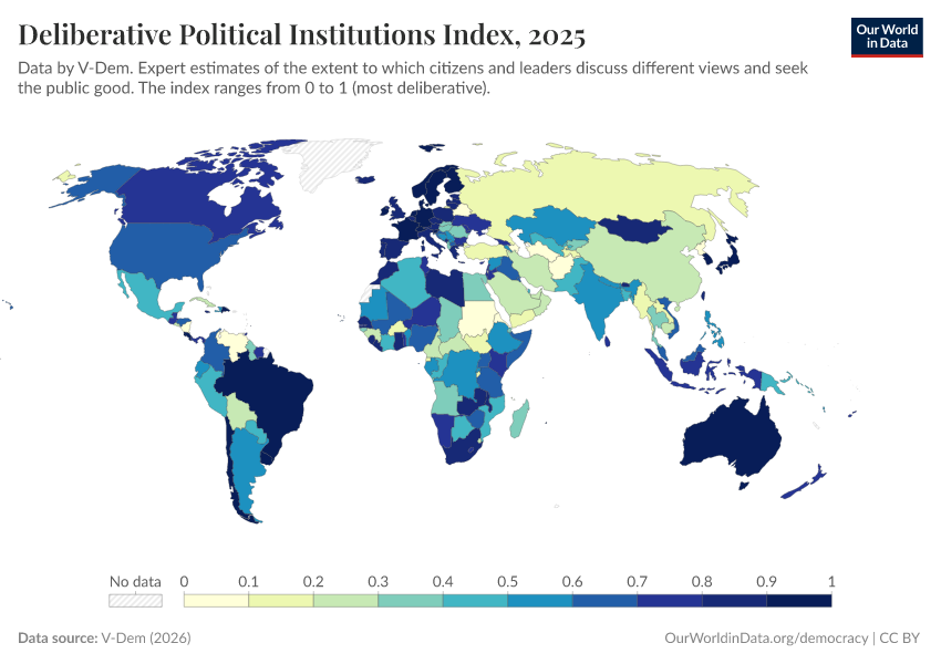 V-Dem (2025) – processed by Our World in Data. “Deliberative political institutions index – V-Dem” [dataset]. V-Dem, “Democracy report v15” [original data]. Retrieved January 5, 2026 from https://search-sync-local-query.owid.pages.dev/grapher/deliberative-political-institutions-index
