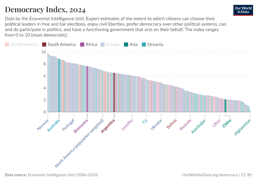 Economist Intelligence Unit (2006-2024) – processed by Our World in Data. “Democracy index – Economist Intelligence Unit” [dataset]. Economist Intelligence Unit, “Democracy Index 2021: The China challenge”; Economist Intelligence Unit, “Democracy Index 2022: Frontline democracy and the battle for Ukraine”; Economist Intelligence Unit, “Democracy Index 2023: Age of Conflict”; Economist Intelligence Unit, “Democracy Index 2024: What's wrong with representative democracy?”; Gapminder, “Democracy Index v4”; Various sources, “Population” [original data]. Retrieved January 5, 2026 from https://search-sync-local-query.owid.pages.dev/grapher/democracy-index-eiu