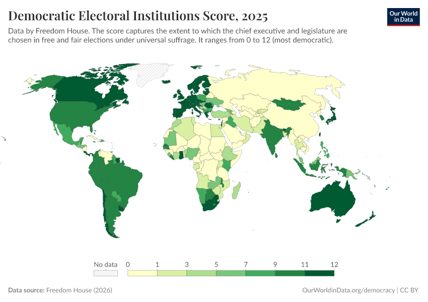 Freedom House (2025) – processed by Our World in Data. “Democratic electoral institutions score” [dataset]. Freedom House, “Freedom in the World” [original data]. Retrieved January 5, 2026 from https://search-sync-local-query.owid.pages.dev/grapher/democratic-electoral-institutions-fh