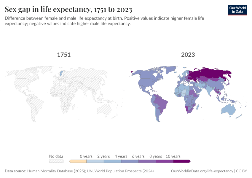 “Data Page: Life expectancy at birth”, part of the following publication: Saloni Dattani, Lucas Rodés-Guirao, Hannah Ritchie, Esteban Ortiz-Ospina, and Max Roser (2023) - “Life Expectancy”. Data adapted from Human Mortality Database, United Nations. Retrieved from https://search-sync-local-query.owid.pages.dev/grapher/difference-in-female-and-male-life-expectancy-at-birth [online resource]How to cite this data