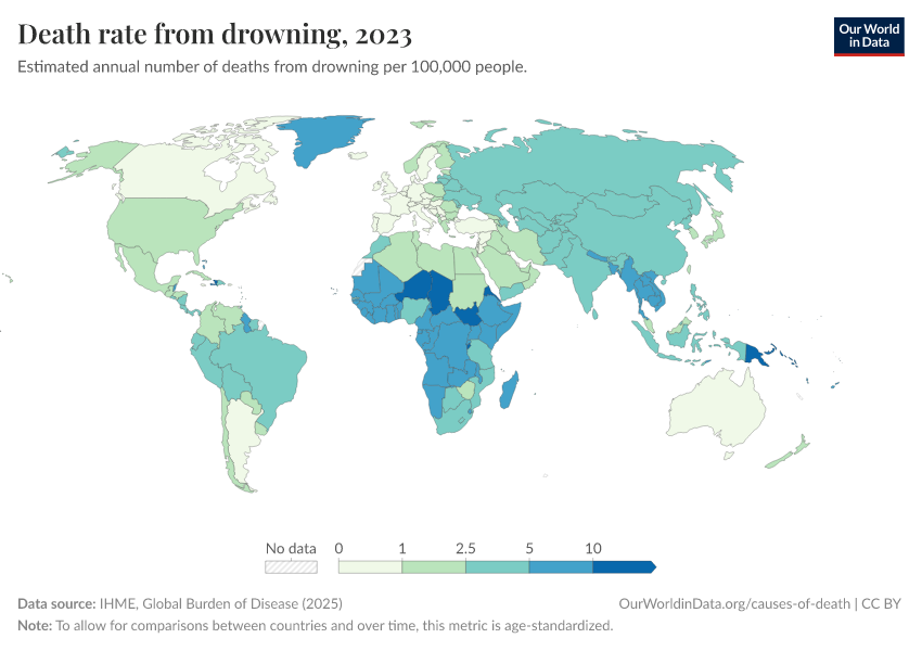 IHME, Global Burden of Disease (2024) – with minor processing by Our World in Data. “Death rate from drowning” [dataset]. IHME, Global Burden of Disease, “Global Burden of Disease - Deaths and DALYs” [original data]. Retrieved January 5, 2026 from https://search-sync-local-query.owid.pages.dev/grapher/drowning-death-rates