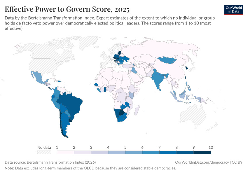 “Data Page: Effective power to govern score”, part of the following publication: Bastian Herre, Lucas Rodés-Guirao, and Esteban Ortiz-Ospina (2013) - “Democracy”. Data adapted from Bertelsmann Transformation Index. Retrieved from https://search-sync-local-query.owid.pages.dev/grapher/effective-power-to-govern-score-bti [online resource]How to cite this data