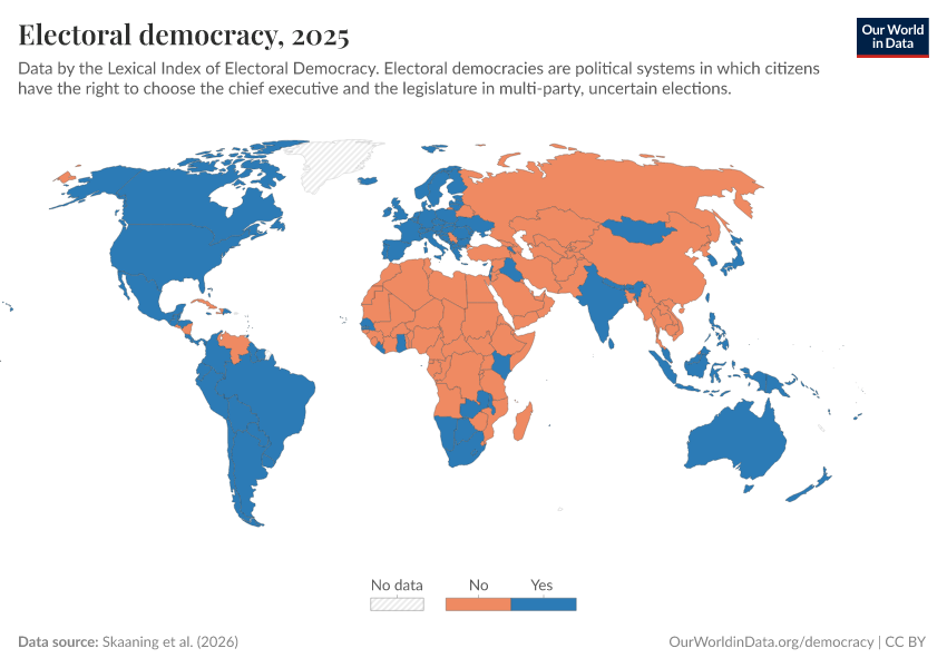 Skaaning et al. (2025) – processed by Our World in Data. “Electoral democracy” [dataset]. Skaaning et al., “Lexical Index of Electoral Democracy (LIED) v6.8” [original data]. Retrieved January 5, 2026 from https://search-sync-local-query.owid.pages.dev/grapher/electoral-democracy-lexical