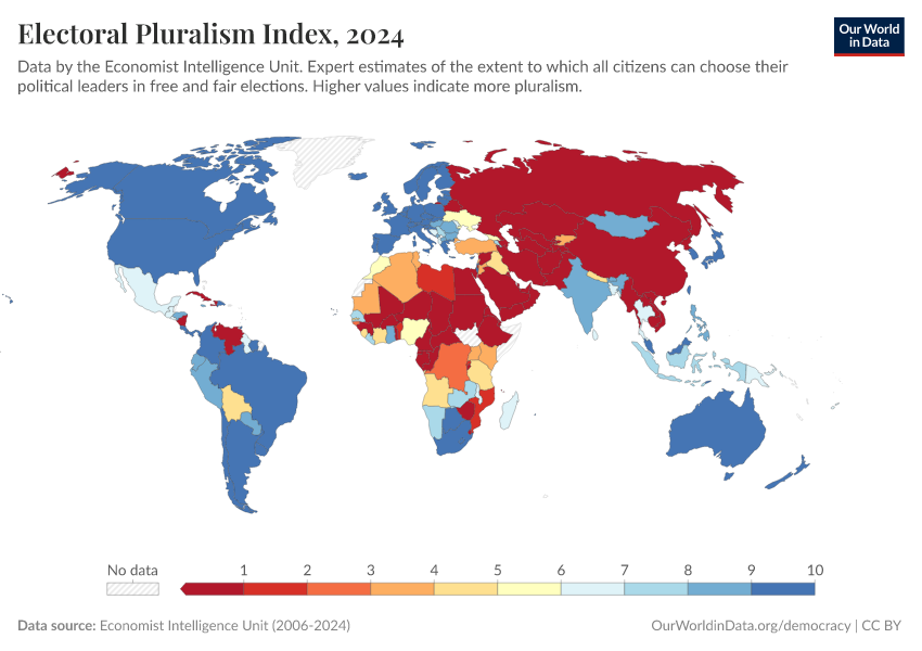 Economist Intelligence Unit (2006-2024) – processed by Our World in Data. “Electoral Pluralism Index” [dataset]. Economist Intelligence Unit, “Democracy Index 2021: The China challenge”; Economist Intelligence Unit, “Democracy Index 2022: Frontline democracy and the battle for Ukraine”; Economist Intelligence Unit, “Democracy Index 2023: Age of Conflict”; Economist Intelligence Unit, “Democracy Index 2024: What's wrong with representative democracy?”; Gapminder, “Democracy Index v4”; Various sources, “Population” [original data]. Retrieved January 5, 2026 from https://search-sync-local-query.owid.pages.dev/grapher/electoral-pluralism-index-eiu