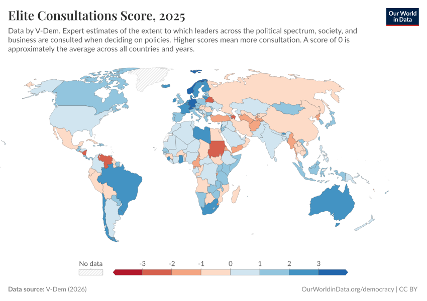V-Dem (2025) – processed by Our World in Data. “Elite consultation – V-Dem” [dataset]. V-Dem, “Democracy report v15” [original data]. Retrieved January 5, 2026 from https://search-sync-local-query.owid.pages.dev/grapher/elite-consultations-score